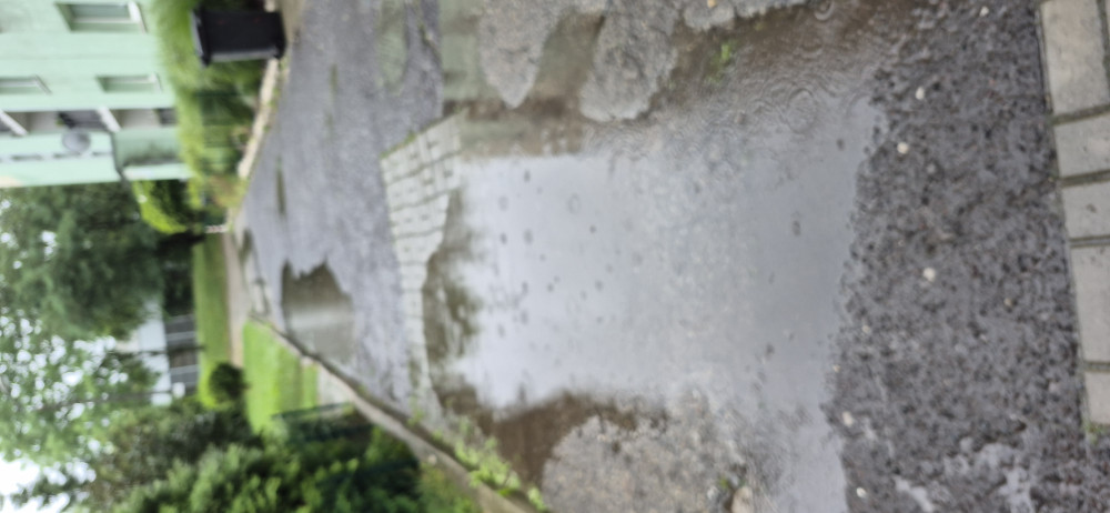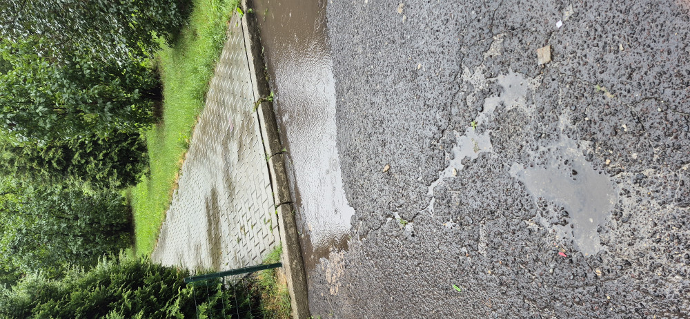 Zalany chodnik wzdłuż bloku 75. Zatkana kratka ściekowa.