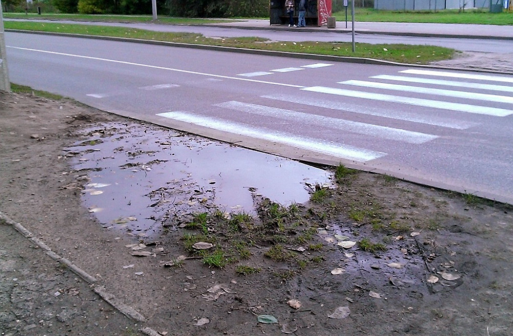 Nie można pokonać bez gumowców przejścia dla pieszych. Zejście z jezdni na chodnik prowadzi przez wąski ale mocno grząski kawałek "trawnika".