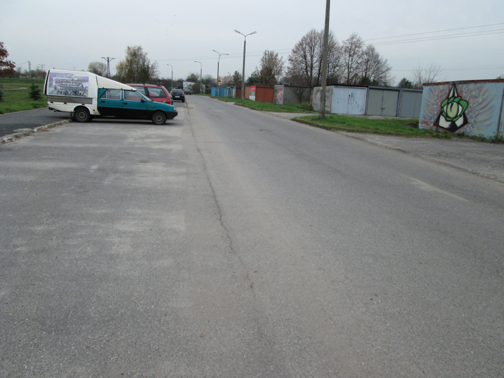 Parking i droga włącznie z łukami przy wjazdach do garaży i wokół studzienek zostały oczyszczone zarówno z piachu jak i trawy. W chwili obecnej ewentualny pył może pochodzić tylko ze zniszczonej nawierzchni wjazdów do garaży (spękany i brakujący asfalt).