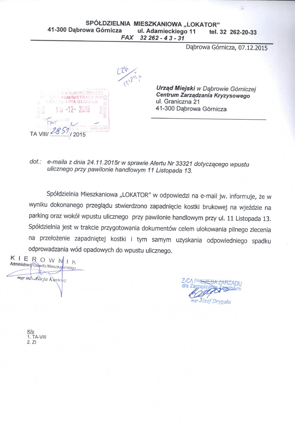 Dąbrowskie Wodociągi Sp. z o.o. w dniu 20.11.2015 przyjęły sprawę do rozpoznania oraz przekazały mailem do WKD. W związku z faktem, że teren znajduje się w użytkowaniu wieczystym Spółdzielni Mieszkaniowej "Lokator" usunięcie nieprawidłowości nie leży w kompetencji tutejszego Urzędu. W związku z powyższym alert przekazano drogą poczty e-mail do SM Lokator na adres: [email protected]. Po otrzymaniu odpowiedzi zostanie zamieszczona jej treść. Jako zdjęcie zamieszczono odpowiedź z SM Lokator - w związku z treścią i dalszą realizacją alertu wyłącznie przez SM Lokator alert oznaczono jako "naprawiony".